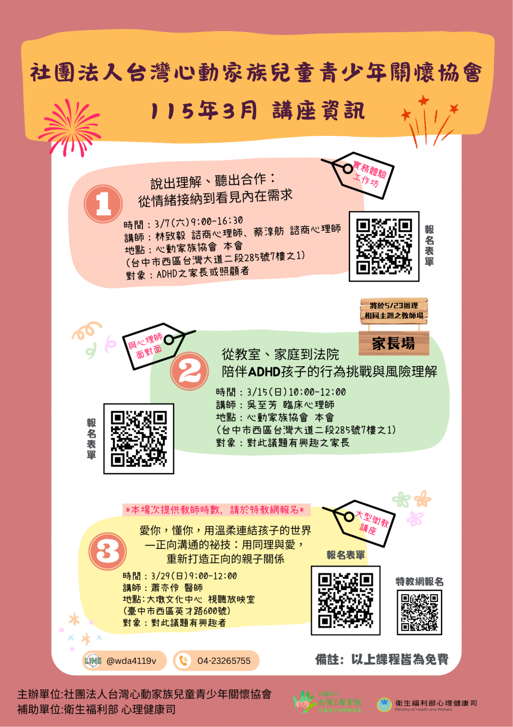 社團法人台灣心動家族兒童青少年關懷協會辦理「115年03月 ADHD 相關主題講座及工作坊」